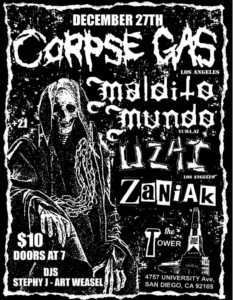 Corpse Gas, Maldito Mundo, Uzai, Zaniak, DJ Stephy J and Art Weasel 12/27/20257:00 pm - 11:45 pm Corpse Gas, Maldito Mundo, Uzai, Zaniak, DJ Stephy J and Art Weasel