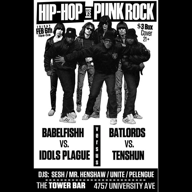 10948924_1532803313666752_462523285_n Published February 6, 2015 at 640 × 640 in 10948924_1532803313666752_462523285_n ← Previous Next → Tonight: Tenshun, Bat Lords, Babelfishh, Idols Plague & DJs Unite, Mr Henshaw, Palengue & Sesh. #hiphopvspunkrock. $3.